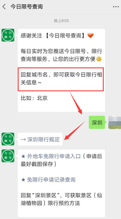 关注成功后,在对话框回复:深圳,即可快速获取深圳限行最新消息、免限行申请入口、免限行申请记录查询、还有深圳景区等入口。