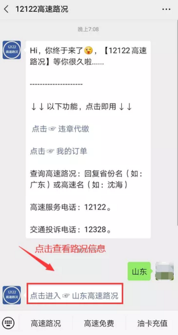 关注成功后,在对话框回复:山东,即可获取山东高速路况入口,如下图:
