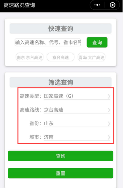 还可进入公众号界面点击左下角菜单【高速路况】---筛选查询,即可查询山东高速路况最新情况。(这个查询更详细)