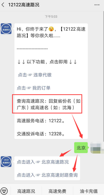 还可进入公众号界面点击左下角菜单【高速路况】---查询框中输入:北京,即快速查询北京高速公路路况。